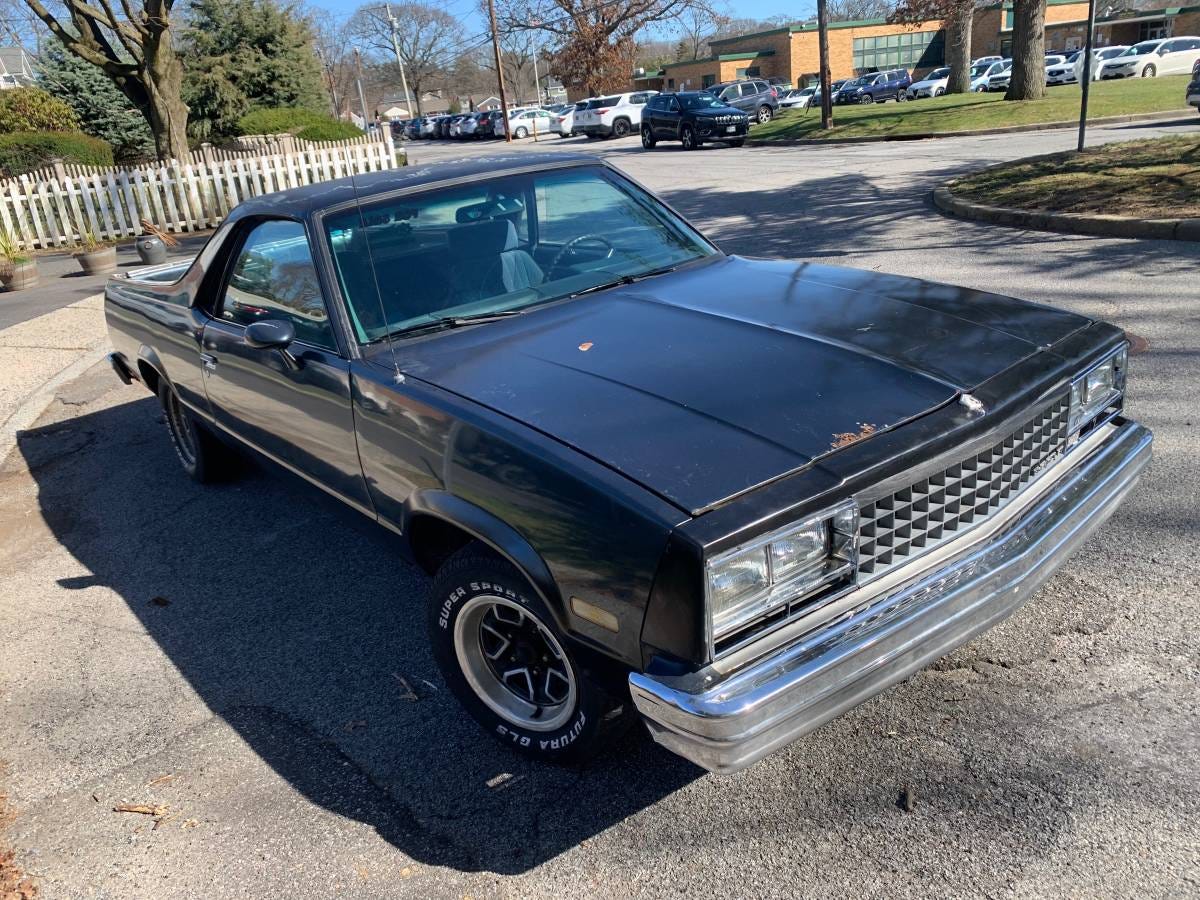 Our next entry from the good people at general motors is the plastic-tipped cigarello of the car world. The Final generation of the El Camino. All of the utility of a Ford Ranger without an ounce of the charm. The anemic 305, the blue velour, the ROAD, put your bike in it? These used to stink of 2008-2014 east williamsburg bushwick banjo raggamuffin expansionist hipster but I believe the Elco has lost every ounce of “status” it ever earned by rotting in front of mckibbin lofts and has returned to its status as the most dirtbaggy thing you can drive. This one is somehow not on cinder blocks on a backroad but instead in Massapequa for 4500